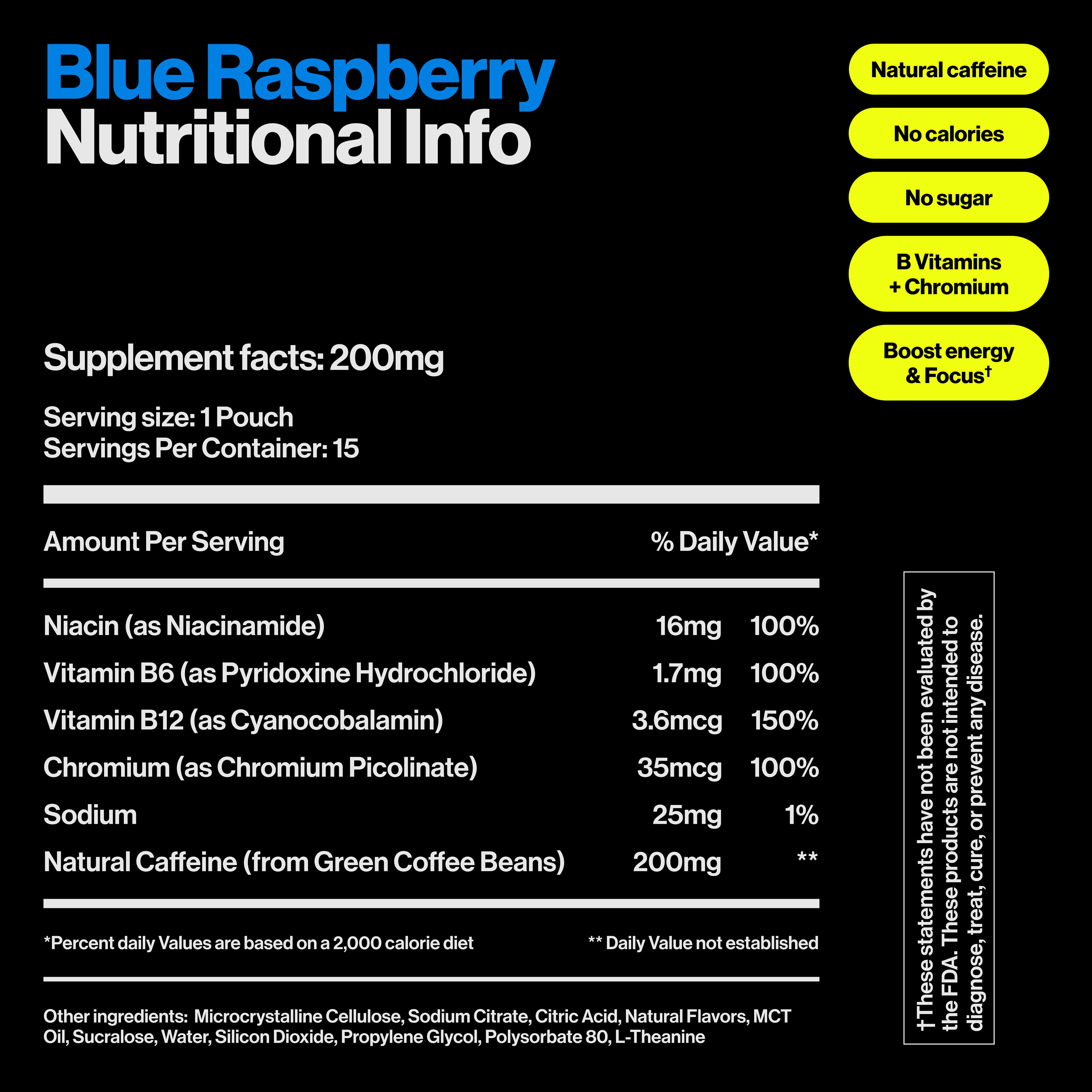 Wip pouches are thoughtfully crafted to support energy metabolism and boost cognitive functions†. We use high quality, natural caffeine, sourced from non-GMO green coffee beans, B vitamins (Niacin, B6, B12), and chromium. For more information check out our nutrition facts section.